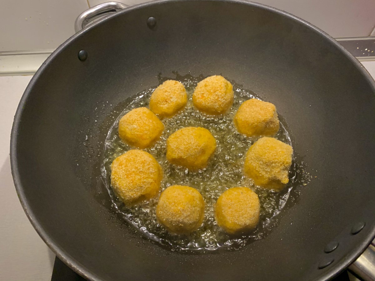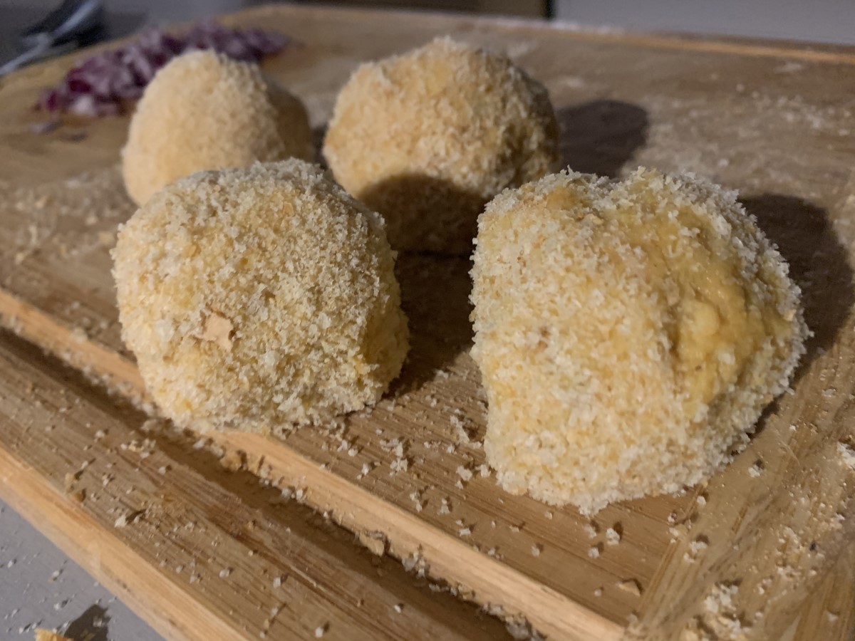 Passate le polpette nel pangrattato e poi friggetelem nell'olio di semi.