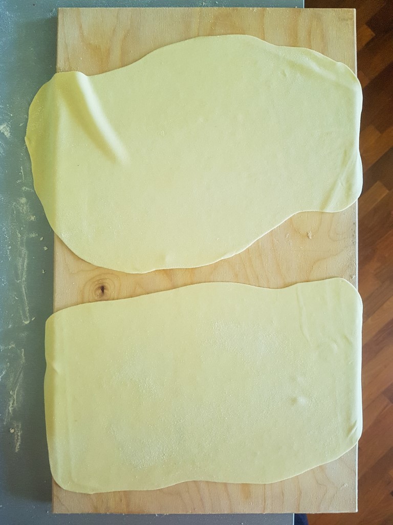 Tirate fuori l'impasto dal frigo, dividetelo in quattro parti e stendete con il mattarello delle sfoglie molto sottili, indicativamente della dimensione della teglia rettangolare che verrà utilizzata.