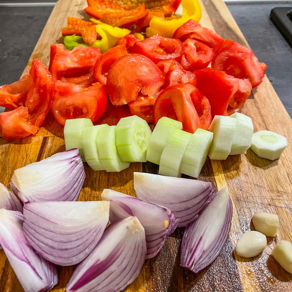 Lavate le verdure e tagliatele a pezzetti dopo aver sbucciato il cetriolo ed eliminato la parte interna dei pomodori e dei peperoni.
